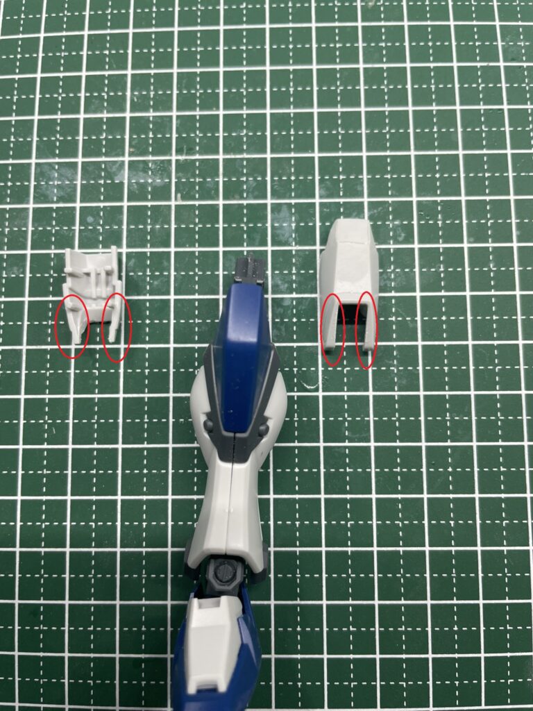 今回のキットは、あまりパーディングラインがありませんが、上腕パーツにうっすらあります(赤丸部分)